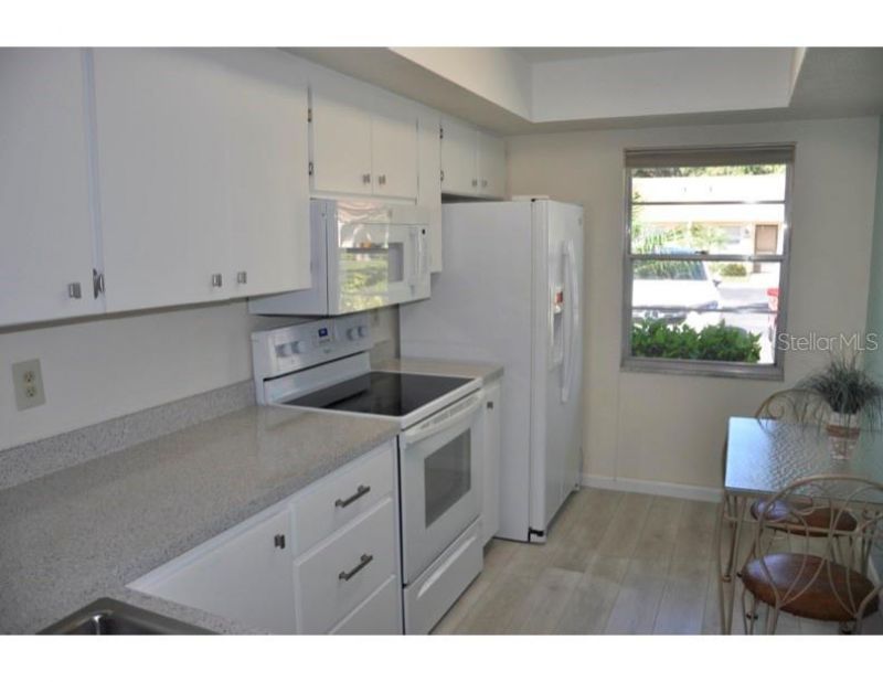 Like new and upgraded gorgeous condo. Minutes from world famous Siesta Key Beach and safely located in flood zone X. All new vinyl plank flooring in living areas and new carpet in bedrooms. Both bathrooms are newly renovated, freshly painted inside and out, along with a total makeover of the kitchen in 2025. Located in the rear of the development this condo is very quiet and secure. New washer and dryer, make this as good as a new unit. Ceiling fans and skylights keep it light and bright inside. Community heated pool and fitness center are open to the residents at their leisure. Clubhouse includes kitchen, fitness center, pool table and rest rooms with showers. Lanai features fully enclosed glass windows with screens, new storm doors front and rear. Gardener's paradise in the rear with lush tropical plants. In front enjoy your reserved private parking spot. Close to shopping and some of the best restaurants in Sarasota.
