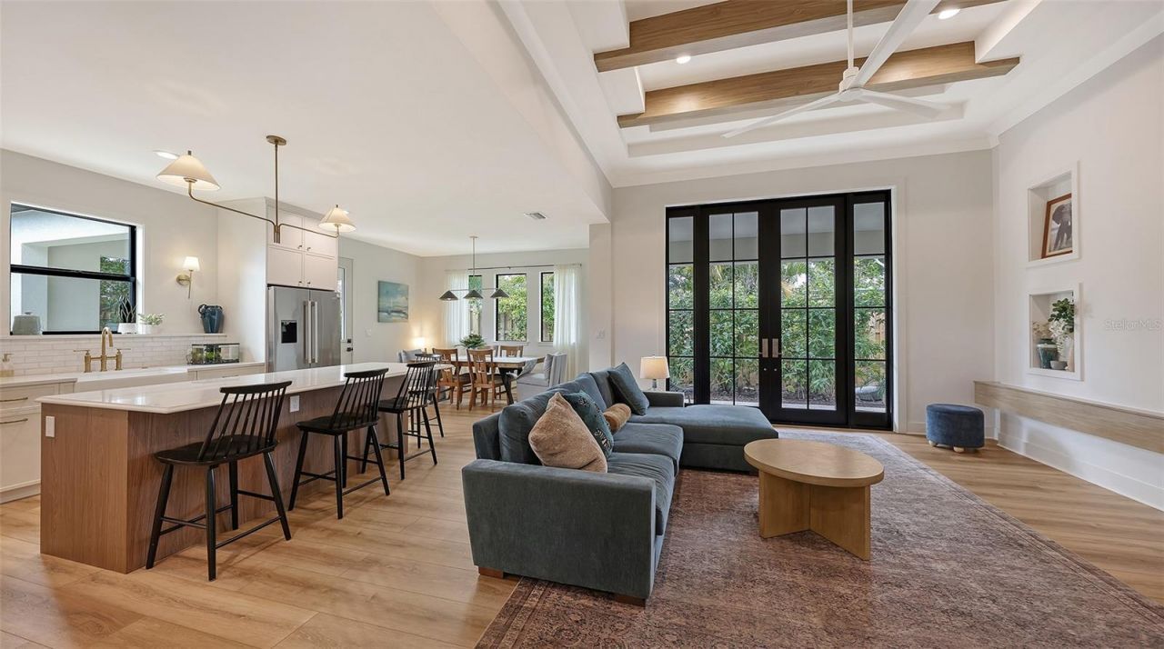 Allegra Built located in the desirable Southgate neighborhood, this custom new build blends an organic modern design with lovely coastal touches. Created for both comfort and versatility, the 2,372 sq. ft. floor plan of open-concept living features 3 bedrooms plus a flexible bonus room, ideal as a home office, den, or creative space. The home includes 2 full bathrooms and an elegant powder room. The designer fixtures and finishes have been expertly done with a minimalist aesthetic that is both stylish and highly functional. Pops of color enhance the warm neutral interior, creating a timeless and sophisticated appeal throughout. A stunning gallery-style foyer welcomes you with classic wainscoting and a skylight that fills the entry with natural light. The impressive great room features a dramatic 12' 8 ceiling accented by striking wood beams, creating a grand yet inviting gathering space. The kitchen is a true centerpiece, showcasing an all-white palette, standalone range hood, expansive quartz island, and a well-sized butler's pantry featuring a wall of gorgeous cabinetry, a dishwasher, and convenient pass-through access to the kitchen. The adjoining dining area is surrounded by three large windows and offers direct access to the covered patio, creating a wonderful setting for indoor-outdoor entertaining and al fresco dining. The primary suite offers an enchanting retreat, complete with a double vanity flanked by illuminated niches, a large frameless glass shower with walls of exquisite tile, artistically wallpapered water closet, a mirrored wall above the vanity, and rich gold -colored fixtures. Massive 10-ft. tall French doors enhance the home's light-filled atmosphere while opening to a covered lanai and private, tropically landscaped yard. Additional highlights include grid-less windows that enhance the seamless indoor-outdoor feel, thick luxury vinyl plank flooring throughout, a spacious two-car garage, and a tiled outdoor shower. The fabulous in-town location places you just moments from an array of arts and entertainment venues, along with abundant recreational, shopping, and dining opportunities. The home is also located within one of the area's most sought-after school districts, known for its strong academic excellence. With its spectacular design elements and beautiful architectural details, this residence creates an atmosphere where you'll want to simply relax, unwind, and savor the beautiful surroundings. It's a place where you and your family can live the perfect Sarasota lifestyle along one of Florida's most picturesque coastlines.