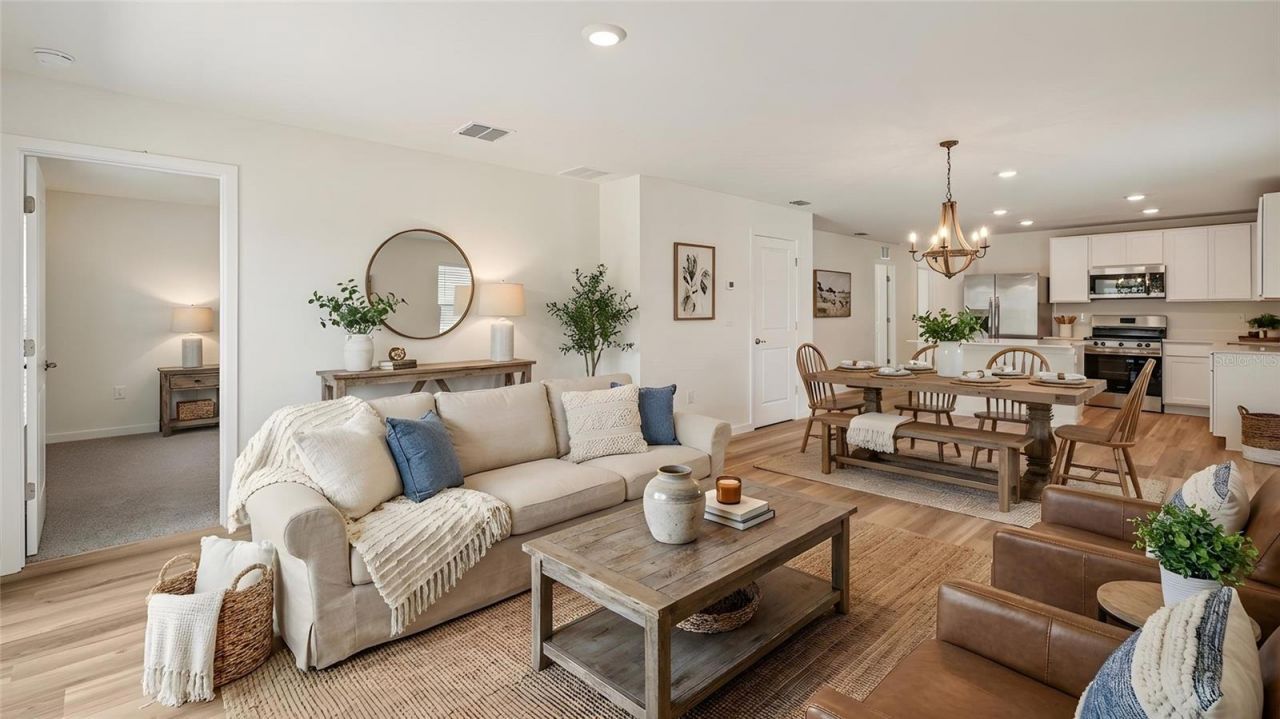 Under Construction. The Aflord floorplan is a thoughtfully designed single-story home featuring 5 bedrooms, 2 full bathrooms, and over 1,700 square feet of open-concept living space. This plan features a bright and airy layout that blends functionality with modern style. At the heart of the home, the kitchen impresses with sleek quartz countertops, a center island, and stainless-steel appliances, creating a stylish and functional space for cooking and entertaining. The adjoining dining and living areas open up to the outdoor patio. The Owner's Suite features a private ensuite bathroom, with a double vanity sink and large walk-in closet. The 4 additional bedrooms share the spacious second bathroom, also with a double vanity sink and quartz countertops. The dedicated laundry room is conveniently situated near the bedrooms and kitchen. The Alford is complete with a state-of-the-art smart home system that keeps you connected to your home at all times. Pictures, photographs, colors, features, and sizes are for illustration purposes only and will vary from the homes as built. Home and community information including pricing, included features, terms, availability and amenities are subject to change and prior sale at any time without notice or obligation. CRC057592.